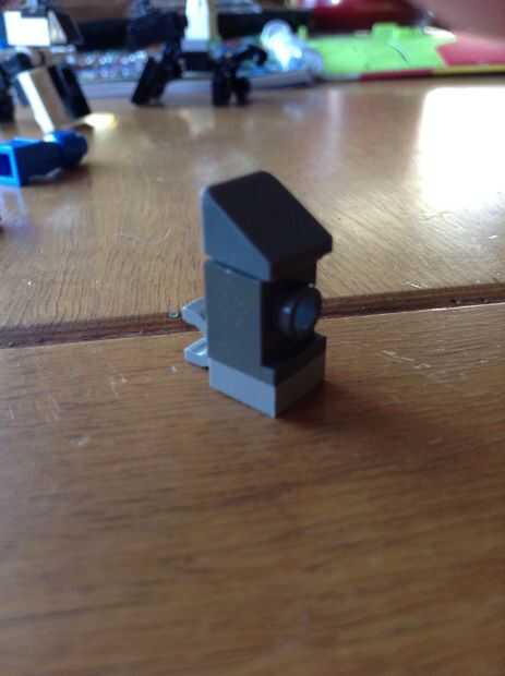 Tome la pieza grande de 1 por 1 con el punto en el lado y conectar a la pieza plano de 1 por 1 con el gancho. Tome el pedazo de mini slant y poner encima la pieza grande de 1 por 1. Luego agregue un trozo de 1 por 1 para el punto en el lado para hacer las orejas. Se muestra en la imagen.