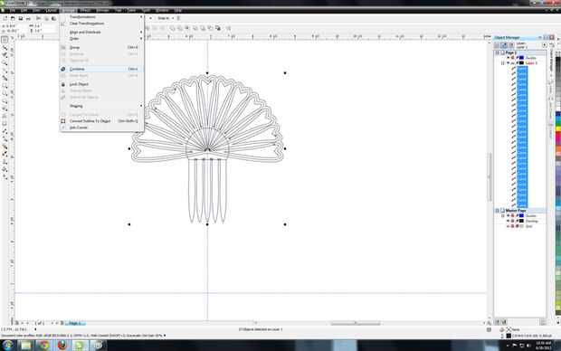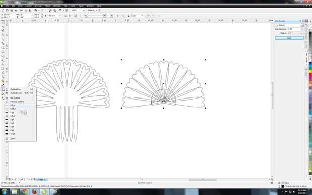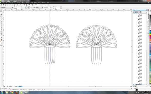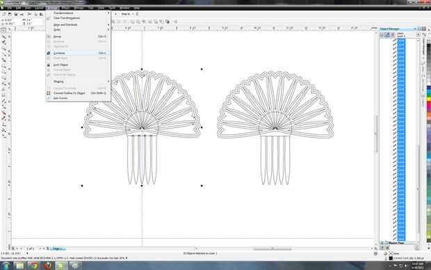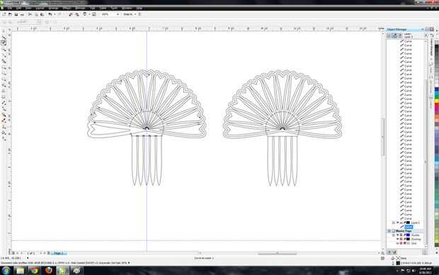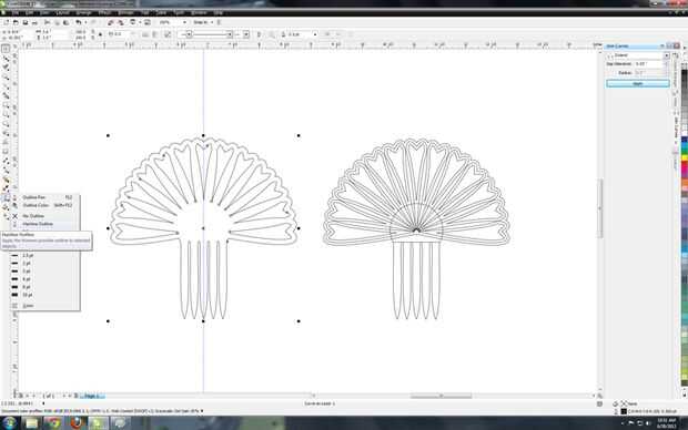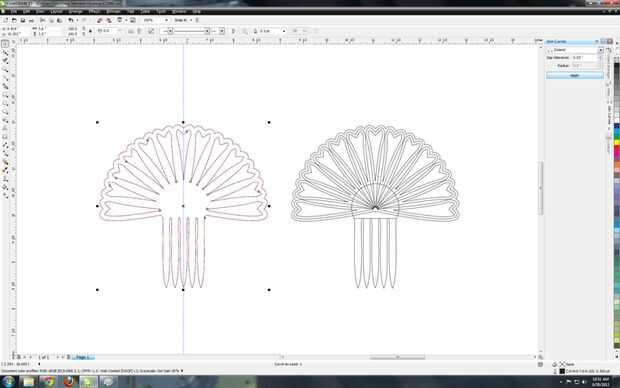 En el último conjunto de imágenes, me he roto todo el proyecto aparte (es decir, cuántos bits vector poco) y entonces yo les recombinado. Esto tiende a dividir el objeto en cada pedacito posible, por lo que yo puedo manipular para el siguiente paso. En este paso, haga dos copias del peine y separar en líneas de corte y grabado líneas. Ya rompí todo aparte y volver a combinada, la herramienta Virtual eliminar segmento es más exacta con los trozos que corta. Así sucesivamente a la izquierda me mantuve sólo las partes que quiero * cut out *; está situados al grosor de la línea del cabello. A la derecha seguí sólo las partes que quiero * ortofosfórico éstos dieron un peso de línea. Al final pensé.75 parecía mejor.