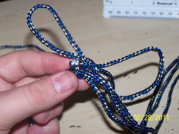 Tomar las piezas de tres de 50 pulgadas y unir los extremos. doble la mitad, piching y manteniendo el centro de las cuerdas. (Sin imagen)