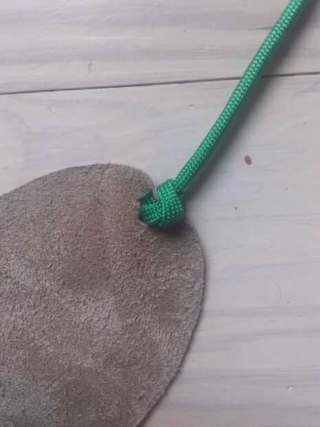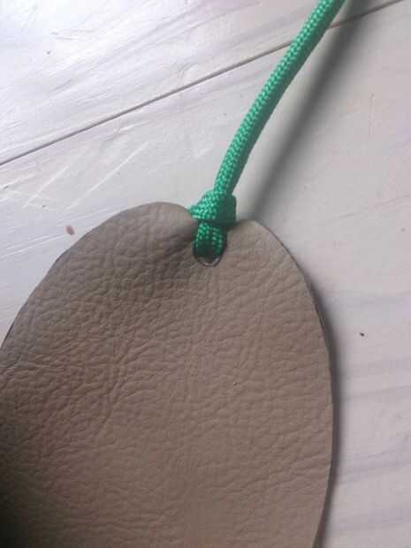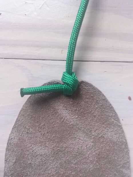 Ahora necesitará agregado sus extremos en la bolsa de la Honda. Como puede ver en la imagen, sólo te alimentas final a través del orificio y hacer un nudo de ocho. tire un poco apretado y ajustar según sea necesario para obtener esa medida de longitud que consiguió en el último paso. Para el lanzamiento final, hacer el mismo, pero no será la misma longitud, por lo que tendrás que ajustar el nudo en la bolsa para conseguirlo sería nivel cuando se mantiene la eslinga como tú cuando tu a tiro. Nota: prefiero la parte borrosa para ser adentro para obtener mejor agarre en las piedras.