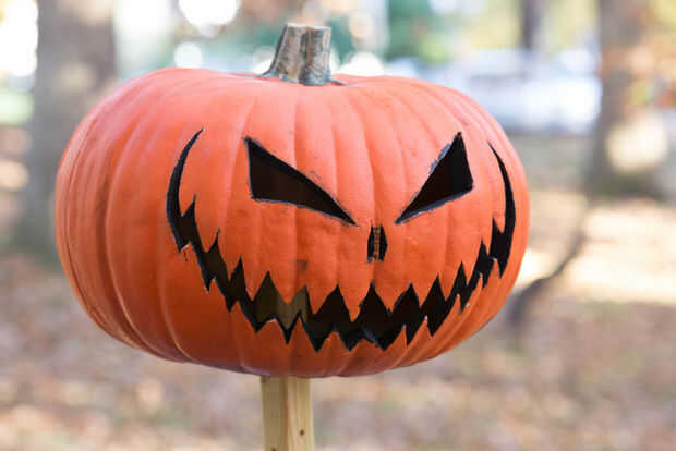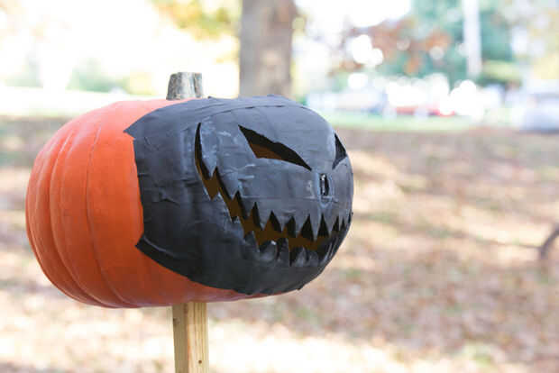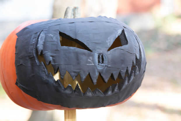 Lo que hice fue utilizar iluminadores cinta (disponible en amazon) para enmascarar la zona. Cinta de lámparas es ideal para todo en su lugar porque es muy pegajoso y fuerte pero está diseñado para no eliminar el acabado. Después de enmascarar la zona, talló la cara a'la Pumpkinrot. Sinceramente, yo podría haber hecho cualquier número de caras, pero él sólo acertó (o ella... nunca está seguro acerca de eso.) Entonces utilicé pintura en spray negro, auto cebado para pintar los interiores de los cortes. He probado con un cepillo y era demasiado difícil.