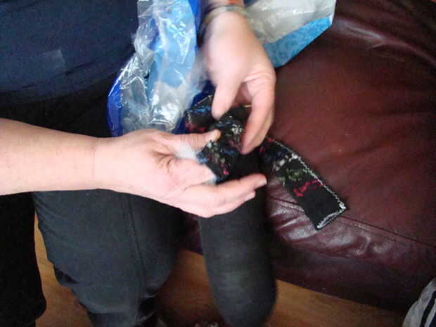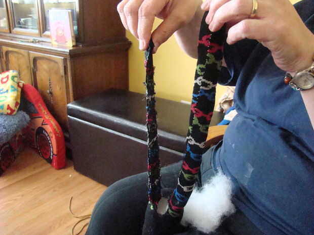 Justo al llegar al pie que muestra la abertura en la entrepierna, detenerse, saque el dedo y comenzar el relleno. Como relleno alcanza la apertura, baje más la pierna y mantener relleno el área nueva hasta que el relleno de la pierna entera. Esto es mucho más fácil que tratar de rellenar todo el brazo, pierna o cola, una vez que ha sido totalmente gire a la derecha hacia fuera. Otra vez, rodar la pierna entre tus palmas para suavizar cualquier terrón.