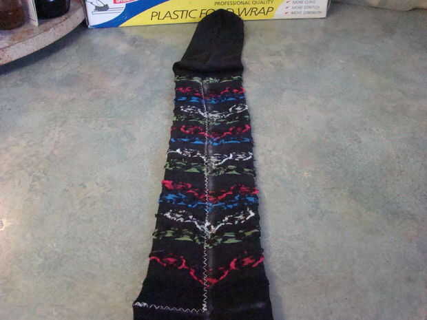 La máquina del hilo de rosca con el hilo de color que desee (partido o contraste, he utilizado el contraste para que puedan ver donde cosí). Primero se debe coser las piernas, a través de la abertura del calcetin, espalda puntada y puntada hacia adelante en cada esquina y el principio y al final para reforzar esos lugares. Al llegar a la parte superior de la línea, reforzar, levantar el pie de presión, gire 180° y cambio de puntada zigzag, luego en zigzag sobre la línea recta.