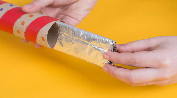 1. para poner junto, comience introduciendo el triángulo de papel de estaño en el rollo de toalla de papel decorado.