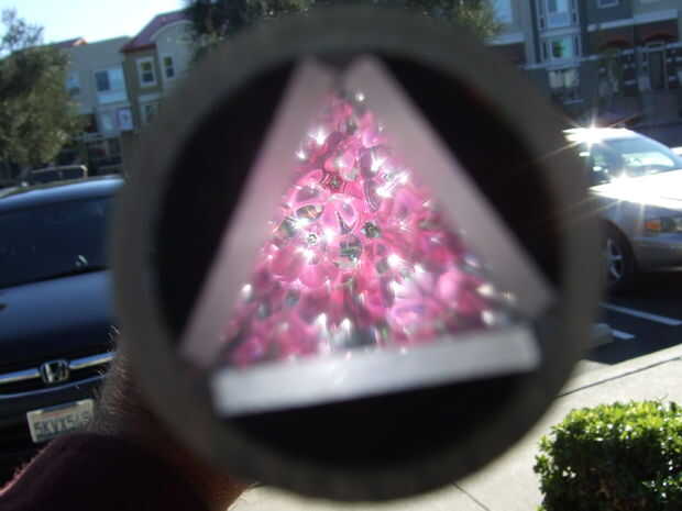 caleidoscopios son divertidos de mirar a través. Fragmento de lo que vemos, los fragmentos se multiplican y ponerlos juntos otra vez en variaciones sorprendentemente complejas basadas en el triángulo.Este caleidoscopio está hecha de tres trozos recta
