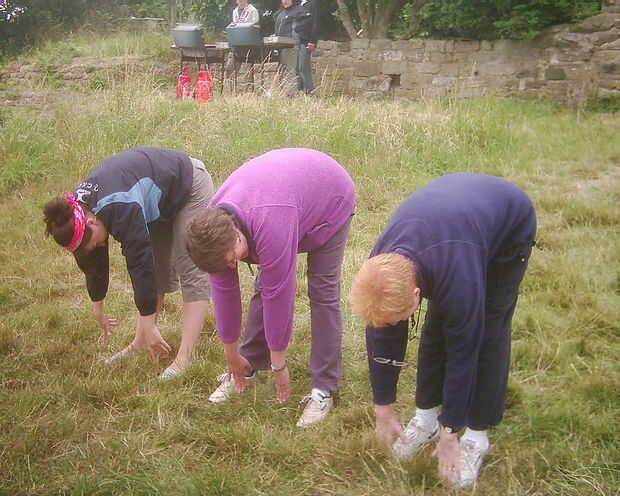 - Doblar la cadera y manteniendo recta la espalda y ambas piernas, toque los dedos con ambas manos.