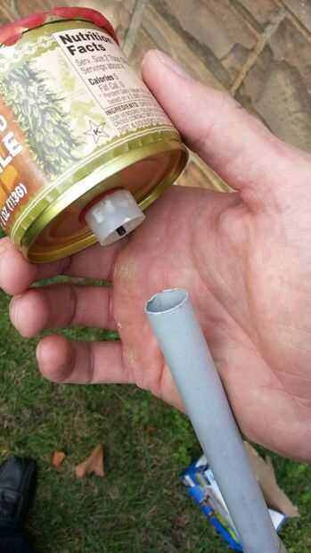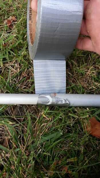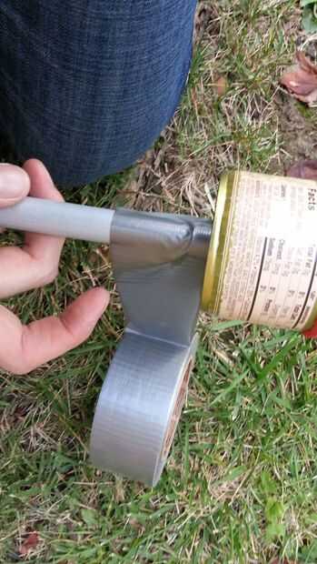Ahora tomamos nuestro recién montada "aspiración garra" y ponerlo en el extremo de nuestra barra de cortina extremadamente largo (en serio, que tiene amplios ventanales 14ft?). Se aconseja la aplicación liberal de cinta del conducto. Lo que no está en la foto Bueno aqui es que envuelve la cinta alrededor, no sólo la tapa de plástico para el polo, pero también la parte inferior la mitad de la lata al polo. Si no haces esto, entonces cuando intenta enroscar la bombilla, a hacer girar el tornillo.