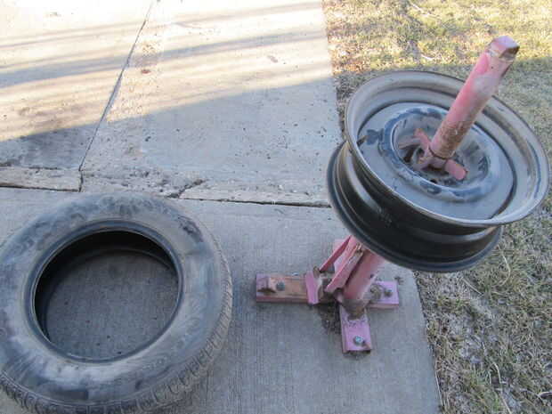 2) centro uso del cambiador del neumático como un punto de pivote para activar la barra de palanca en un círculo para quitar una pared lateral del neumático de la llanta.