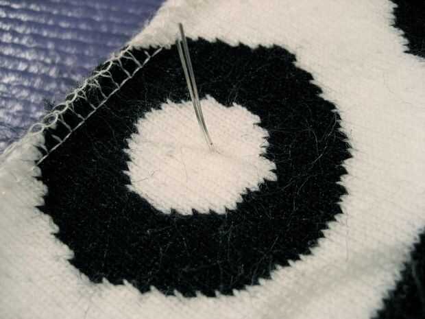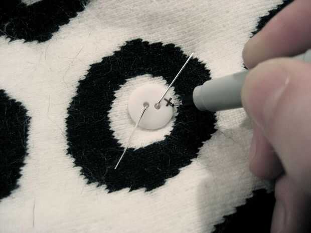 En la parte posterior de la piel, fijar el LED colocando un botón en las puntas. Utilice una superficie suave detrás del LED (como una estera de yoga) pulsar el botón en la parte posterior del LED y poco los cables hasta la superficie del botón. Seguimiento de que fue el plomo largo y marca la polaridad con un '+' o un punto de ese lado del botón.