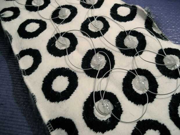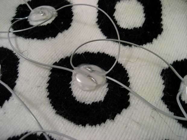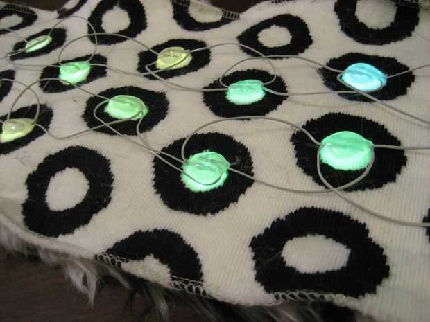 El pegamento ofrece alivio de tensión y aislamiento eléctrico y protegerá los componentes electrónicos de la exposición a la humedad (sudor o lluvia) cuando la bufanda está desgastada y proporcionará protección durante el lavado. En general, recomendaría que punto limpio o mano lavar la prenda en agua fría o tibia y secar completamente. Este tipo de montaje probablemente sobrevivirá lavado suave de la máquina en frío, pero se reducirá la vida de la prenda repetida de agitación y girando, y exposición a otros productos químicos y jabón eventualmente hará que los conductores del LED a ser corroído. No se recomienda la limpieza en seco.