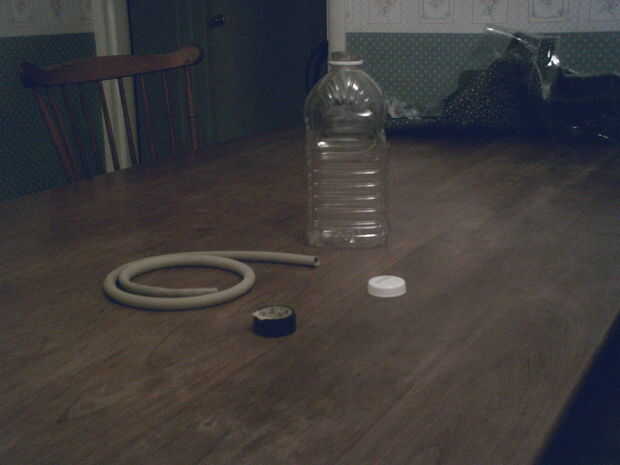 Hay cuatro partes que van en el CamelPack. Se trata de una botella de jugo de manzana en la foto, pero que probablemente usted podría hacerlo igual de bien con algunos tubos más pequeños quirúrgica y una botella de dos litros. También no representado aquí es una pinza para la ropa. El tipo de madera funciona bien.
