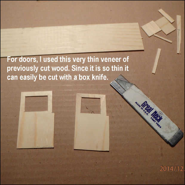 Como se muestra en la foto, puertas y parabrisas se cortan de pino muy fina, cortar la superficie de un 1 por 2. Al corte fino, probablemente de 1/16 pulg., es fácil de cortar con un cuchillo o el cortador de la caja como se muestra. Estas piezas luego se pegan en la cabina y permiten cierta dimensión a la construcción de la cabina. Al pegar, algunos es necesario para mantener las puertas en su lugar hasta que el pegamento ha fijado firmemente.