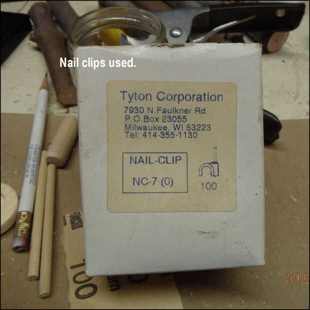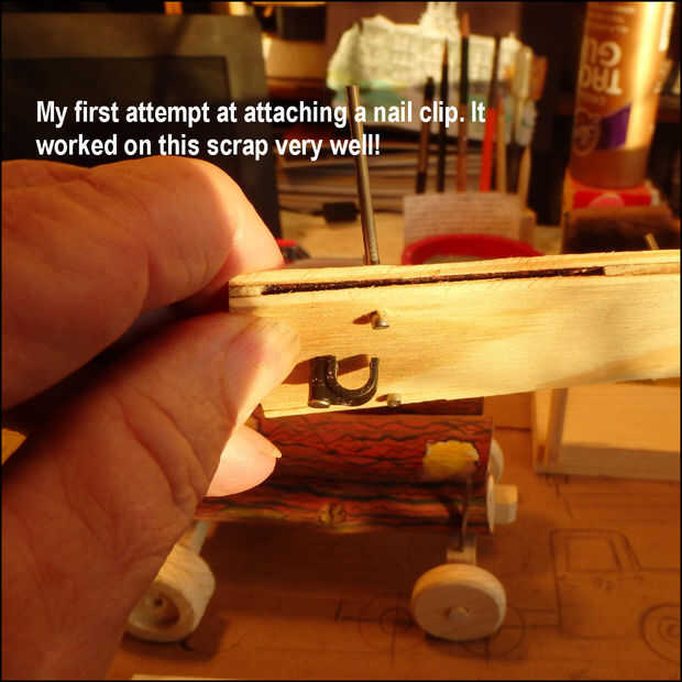 Tuve estos clips de uñas por parte de un trabajo previo, y encajan perfectamente a los ejes de 1/4 de pulgada. Es clavados al en carro primero perforando un agujero ligeramente más pequeño que el clavo utilizado, entonces el clavo se golpea ligeramente suavemente en su lugar. El clavo es un poco más de lo necesario, por lo que simplemente cortar el punto con un par de cortadores de alambre.