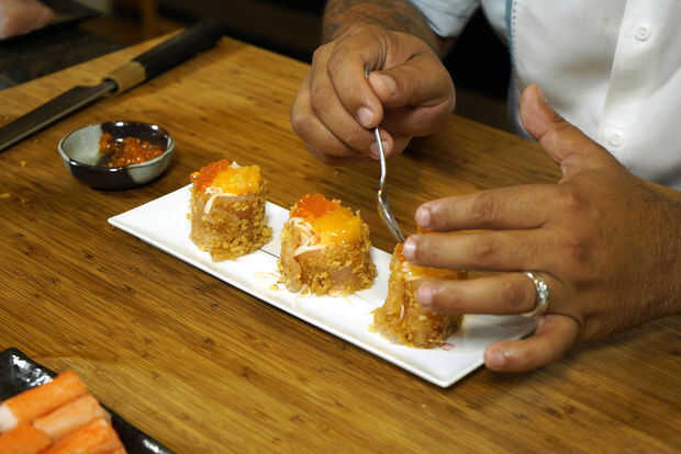 Sushi. Lo japonés que significa "Arroz avinagrado". No tiene nada que ver con pescado crudo, que es el sashimi. Puede contener pescado crudo, pero es no lo que significa el nombre. Así que, ¿te gusta el sushi? ¿Crees que es demasiado difícil de