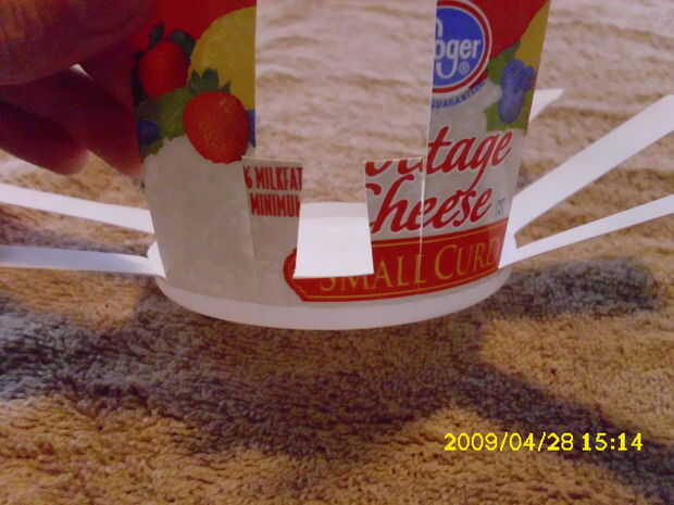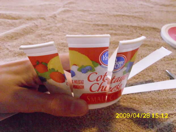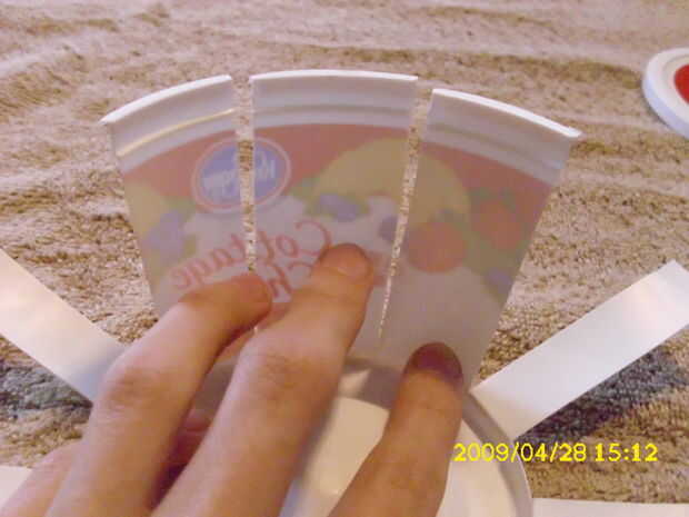Cortar el resto del lado de la taza en tres partes. Luego cortar el medio tercer sobre a medio camino (tercera imagen) y cortado en tercios también. Luego se corta el plástico entre los tallos del ojo hacia fuera (cuarta foto). Ahora pasando a las garras.