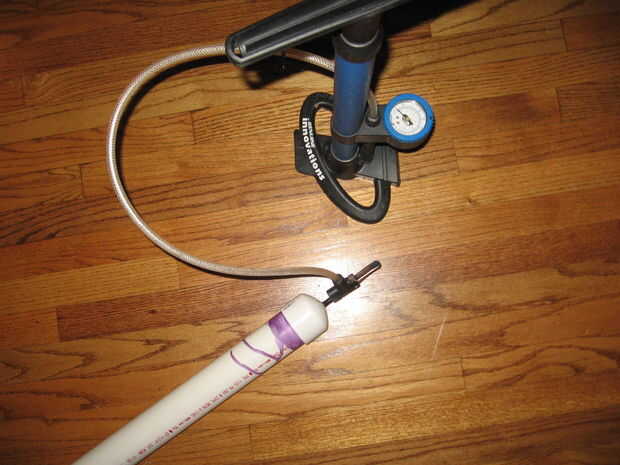 Para cebar el cañón, bomba de aire en la válvula de la llanta de bicicleta con una bomba de bicicleta como se muestra. Alrededor de 20 bombas es suficiente. Para disparar, carga de munición (como una toalla de papel húmeda o una papa) en los barriles. Debe encajar bien. Luego tire de la válvula de bola en posición "abierta".
