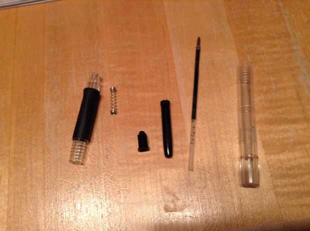 Para desmantelar el inicio de la pluma, extrayendo la parte superior. Ahora tome el resorte de la parte superior. A continuación, empuje la parte que haga clic en junto a la pieza pequeña que contiene la parte real de la pluma. Ahora debería verse algo como esto.
