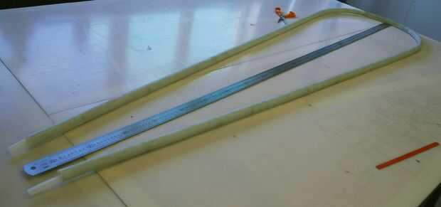 El núcleo de cristal es ligeramente lijada y lista para el siguiente paso: endecha para arriba de las capas de carbono pre-impregnado. Tenga en cuenta que dejé el tubo interior de silicona dentro de la base de vidrio.