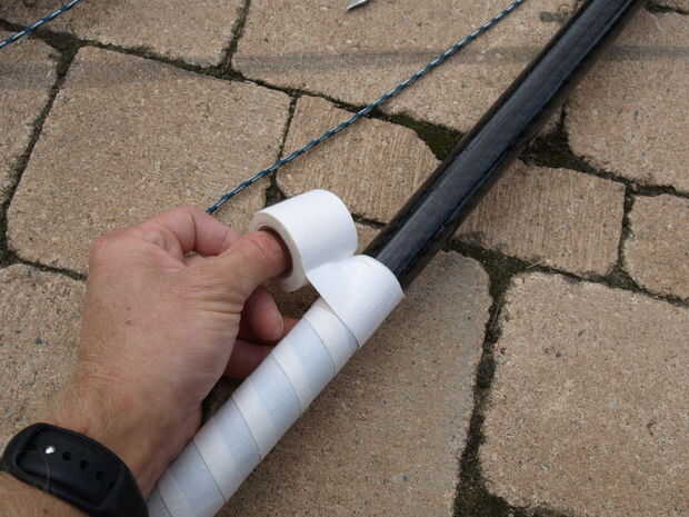 El diámetro de la pluma sin agarre es 29 mm. Hay empuñaduras de repuesto pluma disponibles que pueden ser enlazados, pero están hechas de espuma gruesa de 2 mm. Esto haría que el auge a espesa para mi gusto, así que utilicé la cinta del palo de hockey (elegir blanco a ir muy bien con mi vela blanca de VMG.