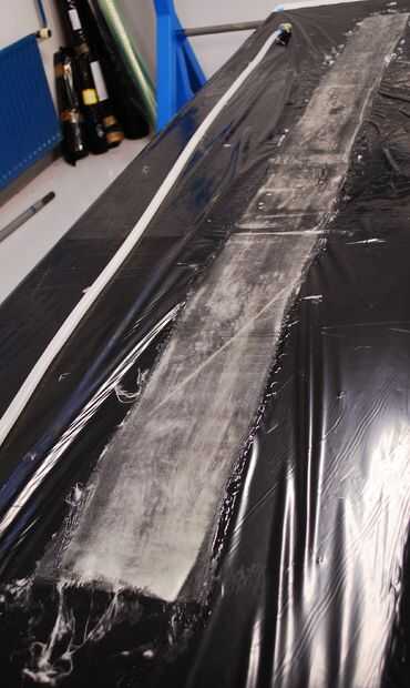 Para el vidrio pre-impregnado una gran mesa se cubre con una lámina. Una capa de vidrio (200 gr/m2) de 140 mm de ancho se rueda hacia fuera sobre el papel de aluminio. Un epoxi de dos componentes se mezcla y se vierte sobre el vidrio. La resina se extiende utilizando una escobilla de goma.