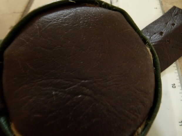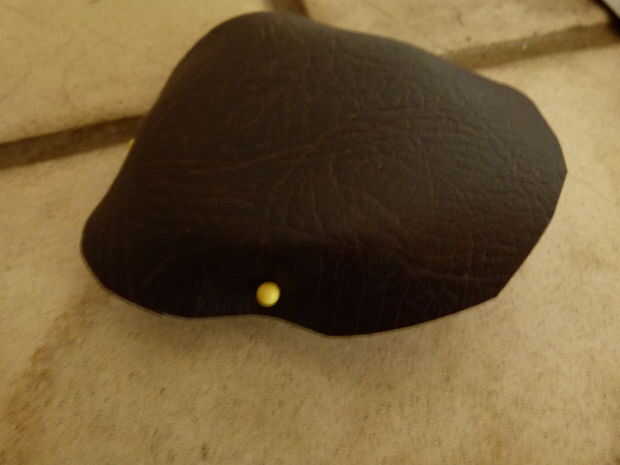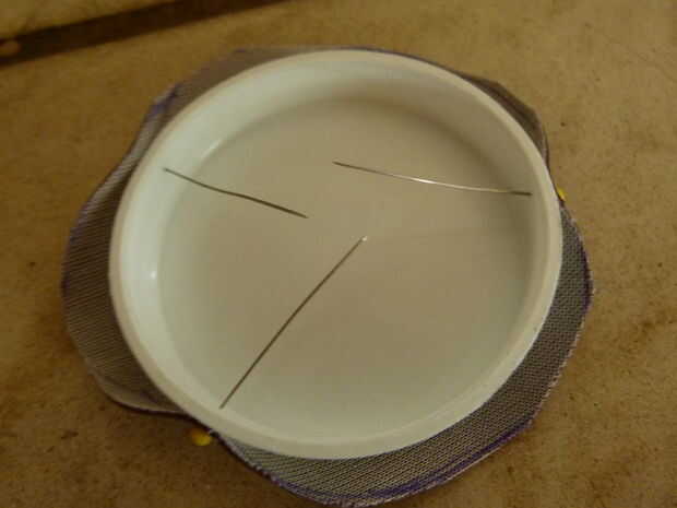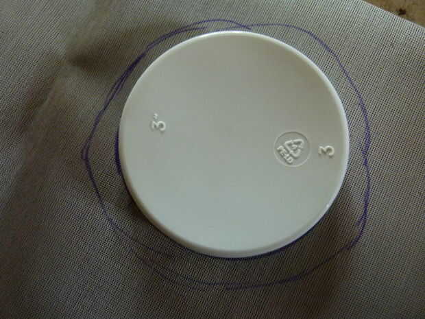 Sembrar el material marrón en la tapa de plástico con el hilo y la aguja de tapicería. Corte extra.