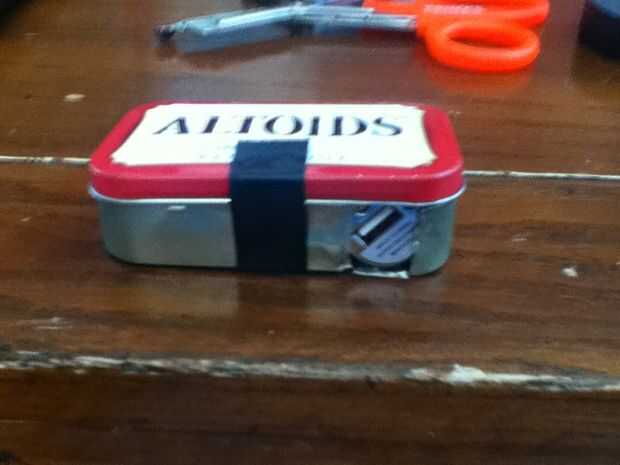 pido disculpas en avanzada para trabajar un proyecto terminado, la pintura no era buena, que no estaba usando una pintura spray para él.Paso 1: Elementos necesarios 1. Altoids Tin2. taladro con broca de3. cargador de teléfono4. pinza 9 voltios de la