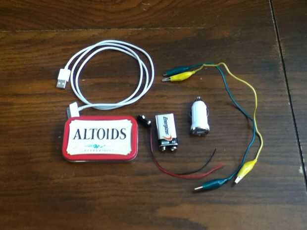 pido disculpas en avanzada para trabajar un proyecto terminado, la pintura no era buena, que no estaba usando una pintura spray para él.Paso 1: Elementos necesarios 1. Altoids Tin2. taladro con broca de3. cargador de teléfono4. pinza 9 voltios de la