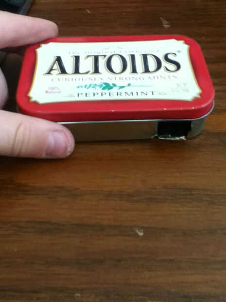 Conecte la batería de 9V al conector de presión y poner el cableado en la lata Altoids. En el exterior de la lata Altoids, marcar donde se encuentra el plugin USB. Luego use unas tijeras cortadoras de metal para cortar la sección que marcó.