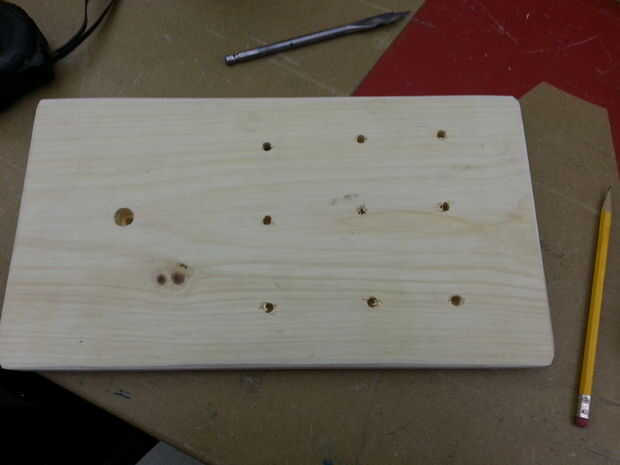En el otro extremo del taladro 9 o su número preferido de los agujeros que servirán para sostener los carretes individuales de hilo.