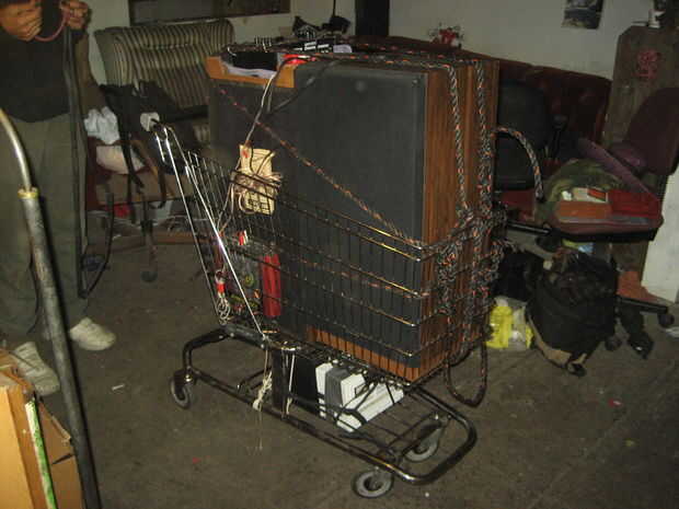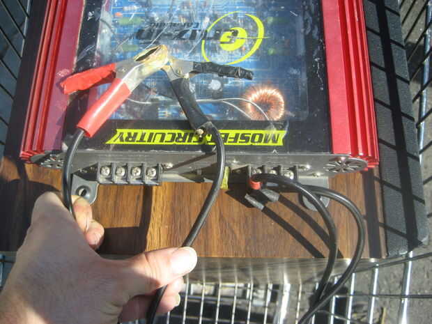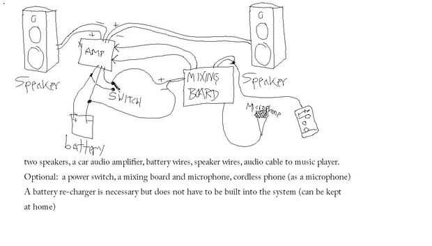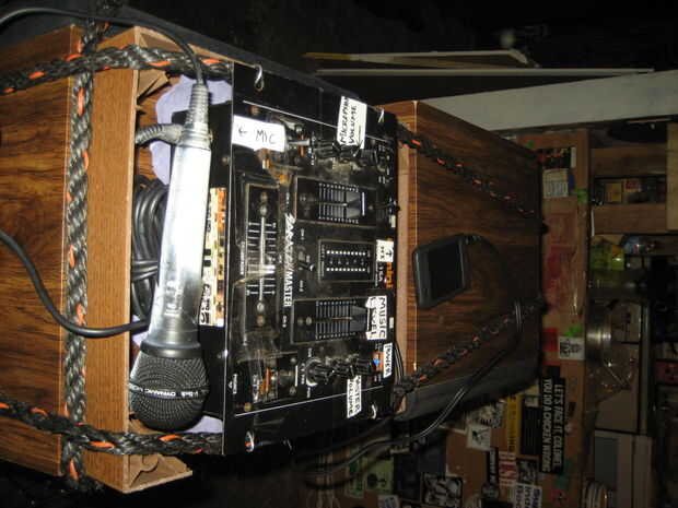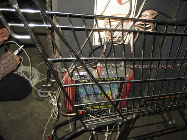 Utiliza un carrito de la compra como una plataforma resistente y móvil. Un amplificador de audio del coche funciona muy bien con una batería de coche, y unos altavoces normales decentes sellar el trato. Un cargador de baterías incorporado asegura que nunca se olvida de respetar su batería frágil, y un tablero de mezcla (que puede manejar 12V DC) le permite añadir un micrófono o dos, tomando el concepto al siguiente nivel.