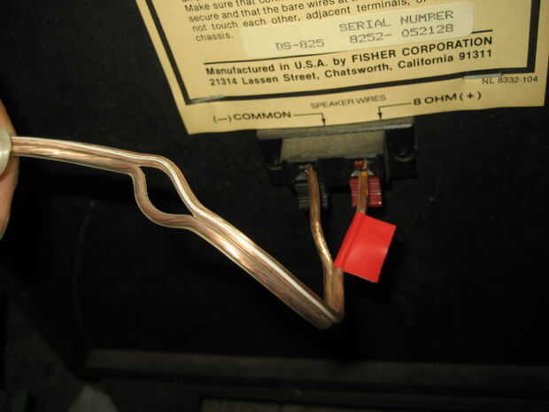 Primera imagen: cables de altavoz conectado al altavoz (este altavoz, tienes que empujar lo plástico, en el cable y luego dejar ir). El rojo es además, el otro es menos. Este cable tiene una raya blanca por un lado, así que poner cinta roja por ese lado, en ambos extremos del alambre, para evitar la confusión.