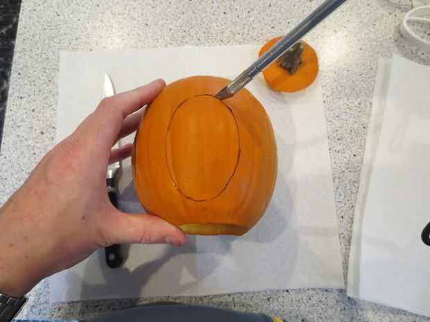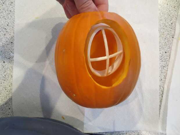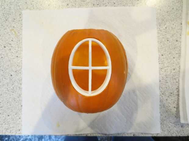 Cortar la calabaza en el exterior de la línea del marcador e instalar los insertos de adentro hacia afuera.