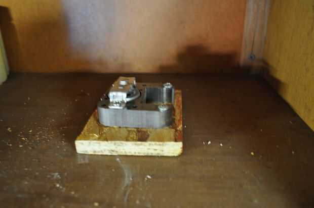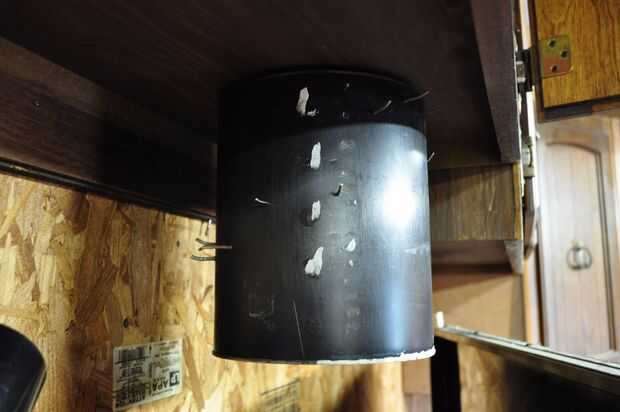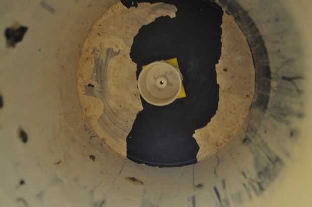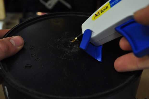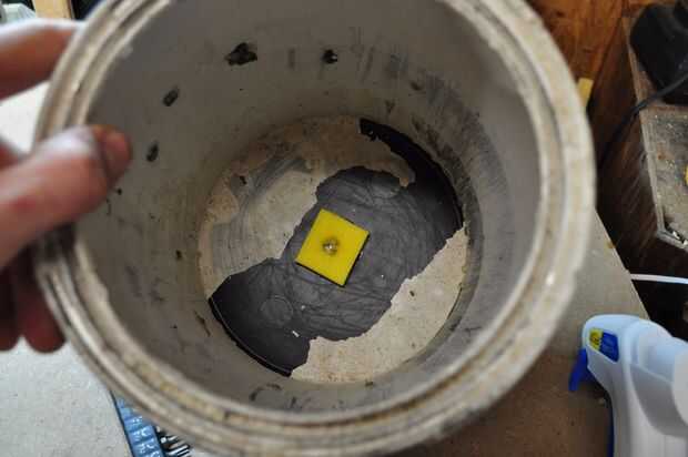 Una vez fijada la pieza de espuma, luego poner un punto de pegamento caliente en el agujero en la parte inferior del cubo (que es la parte superior del carrusel) y rápidamente Levante el cubo en el eje de pivote mientras aplica presión a la Asamblea de pivote para impedir que siga apareciendo. Cuando usted ha presionado el cubo lo suficiente por lo que hay sólo alrededor de una media pulgada de espacio entre él y la parte inferior del gabinete entonces reténgalo ahí hasta que el pegamento se seca.