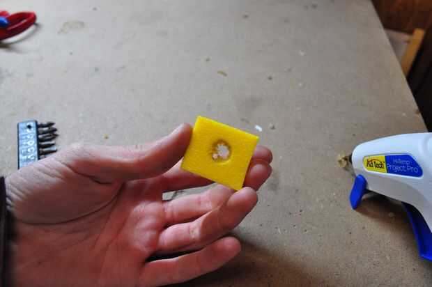 A continuación preparar la canastilla para montar te necesita tomar una 1-1/2 "x 1-1/2" pieza de espuma y perfore un orificio de 1/2" en el centro de la misma. Pegamento al fondo de la cubeta sobre la que suscitó la burbuja en el centro. De esta manera usted tendrá una superficie plana para pegar la pieza del ventilador para más adelante.