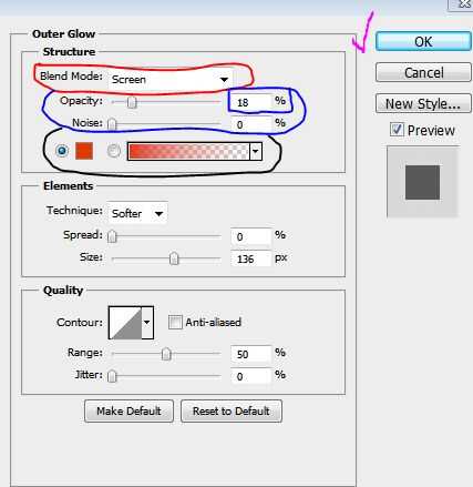 Para el 'Resplandor exterior', recomiendo una mucho menor opacidad. Usted puede jugar con opciones de mezcla y el color que desea brillar. Pulse el botón OK cuando haya terminado.