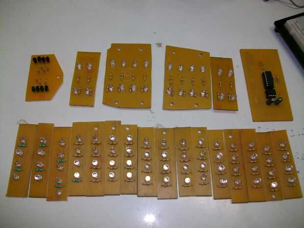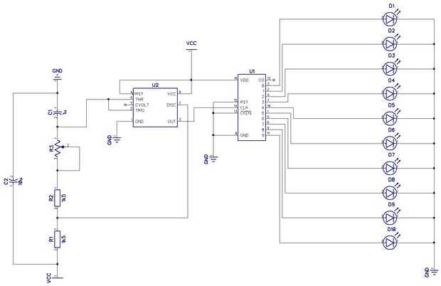Para aquellos interesados en las cosas de electrónica, simplemente se utiliza un temporizador 555 y un contador de década 4017 para manejar 16 leds tableros con 4 leds cada uno y dos tablas más de diferentes, con 8 leds cada uno y dos otras tablas que no están conectadas al circuito 555, pero todavía, tiene 4 leds cada uno, con ~ 90 leds en total! Everythings salga 8 baterías del AA (12v)