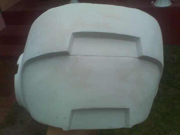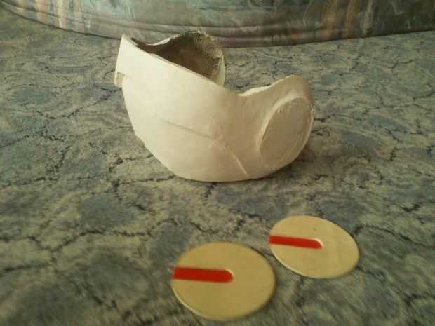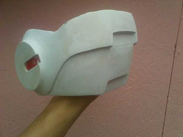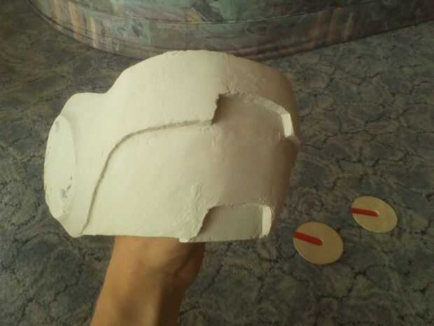 El método es el mismo: resina, fibra de vidrio, de relleno, arena, pintura. En el casco de Iron Man real las orejas no son sólo un simple círculo, pero en la base de papel son. Hice las orejas originales de una placa de madera de espesor 3mm y había pegado un pedazo de plástico en la parte inferior de ellos. Luego pegué las orejas en su lugar. Se puede poner la cabeza dentro hasta que haya quitado la parte trasera, por lo que usted debe utilizar magnest para hacerlo desprendible.