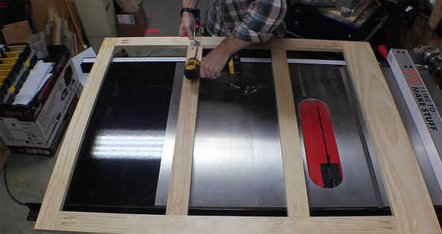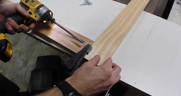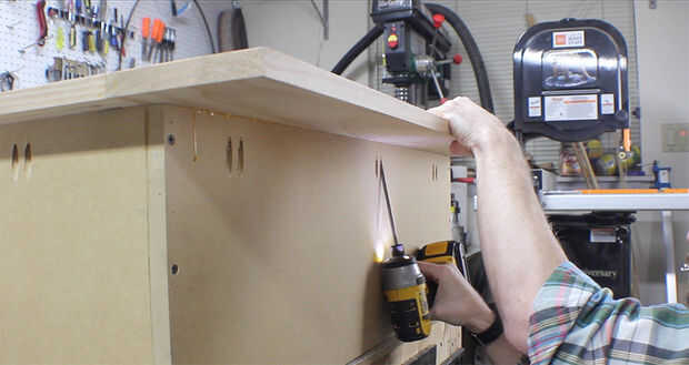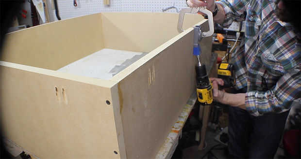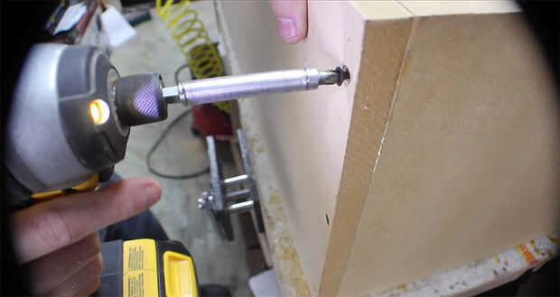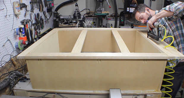 La cara frontal se hizo con agujeros de ocultación y ajusta la apertura de la sala. Luego añadir piezas para los frentes de los estantes. El gabinete se hace del MDF, tamaño en el interior dimensiones del marco frontal. Era una caja básica, unido con pegamento y tornillos avellanados. Hacer agujeros de ocultación en los paneles laterales, para conectar el marco frontal.