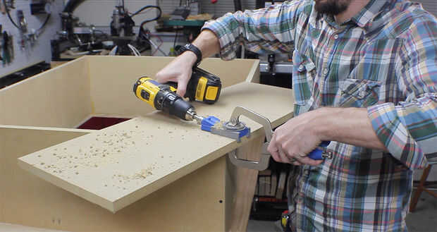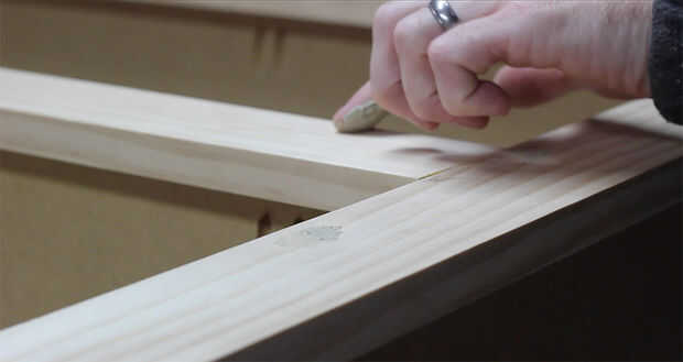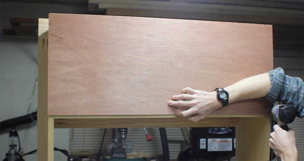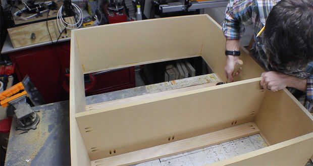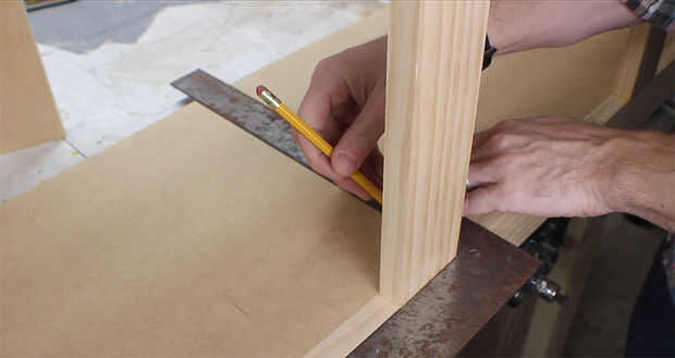 Usando un cuadrado, trazar líneas de referencia para la colocación de los estantes. Cortar MDF para estantes y agujeros de bolsillo en la parte inferior. Usando pegamento, alinee las estanterías, antes de atornillar en por todos lados. Llenar los agujeros en la estructura con relleno de madera y arena suave. Añadir madera contrachapada de 1/8 a cada estante con unos clavitos, haciéndolo fácil de quitar en caso de emergencia.