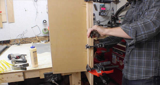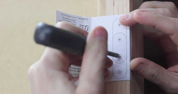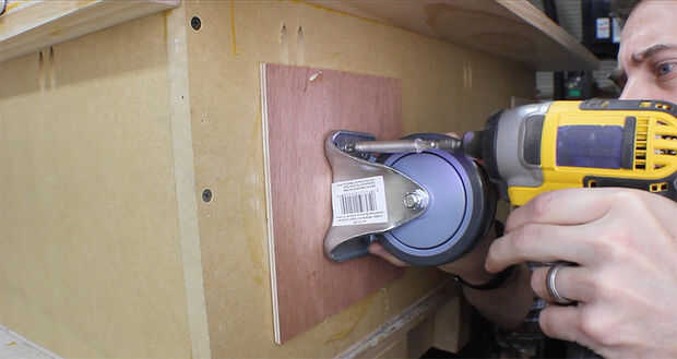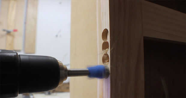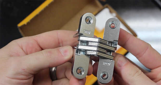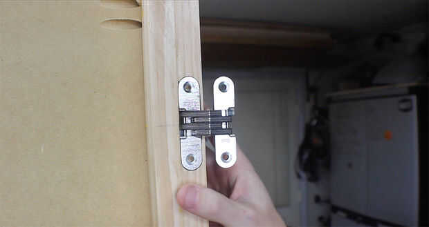 Pegar una tira de refuerza en la parte trasera del lado de las bisagras del marco. Utilice la plantilla incluida para colocar las bisagras. Estas bisagras ocultas gran trabajan para esta aplicación. Perforaciones, por instrucciones de la bisagra. Limpie la mortaja con un cuchillo y un cincel. Coloque la bisagra, pre taladro los orificios y atornille en su lugar. Colocar ruedas de vehículos pesados, ángulos lejos del lado de bisagra.