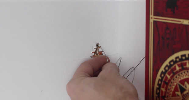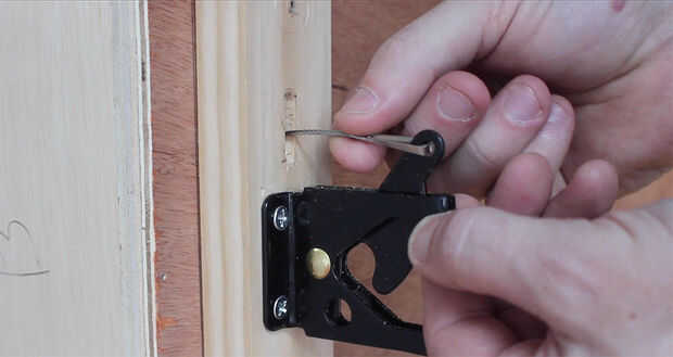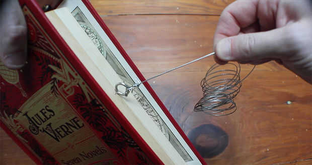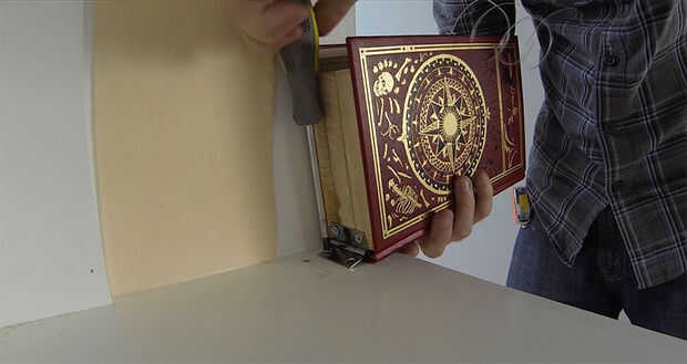 Corte una ranura, sobre el cierre, para el cable pase a través. Añadir un ojete y calibre grueso alambre a la parte posterior del libro. Usando una bisagra, conecte el libro al estante. Alimente el alambre por la ranura que hiciste anteriormente. Conecte el cable para el pestillo. Ajuste de modo que el libro se abre y cierra el pestillo.