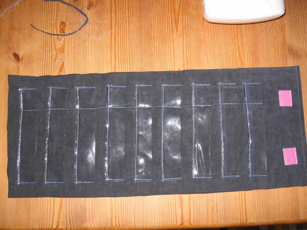 1. coser las longitudes, luego los lados. Una manera fácil de hacerlo sin cortar entre cada rectángulo diferente, es coser, luego cuando llega al final, sólo mover la aguja y coser otra vez, cuando haya terminado, entonces usted puede cortar entre cada hilo de rosca. Caso, usé un punto triple, que es más fuerte, así que si sólo usas una sola puntada, quizá quieras reversa puntada en el extremo de cada rectángulo (para mantener el hilo de corte al hilo hacia fuera si alguien apretamientos, estiramientos, en el plástico). Nota: también usé la configuración de 'estiramiento elástico', porque el pana y el plástico mantienen agrupar. Experimentar y ver lo que funciona mejor para usted.