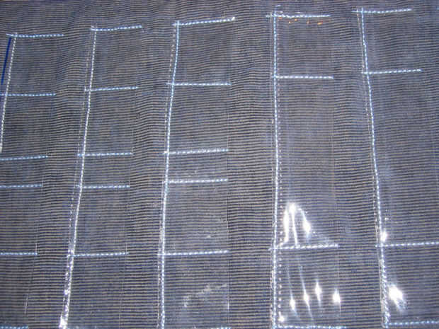 3. Baje la aguja en su lugar (la palanca del pie prensatela está levantado en el momento), dando a la sala de juego suficiente para el plástico se estiran hacia abajo con las puntadas. Creo que esto podría ser unos 2-3mm, pero si usas a tela puede que sea más estricta. El plástico era bastante grueso, por lo que dio una pequeña sala. Es elástico, por lo que creo que importa mucho.