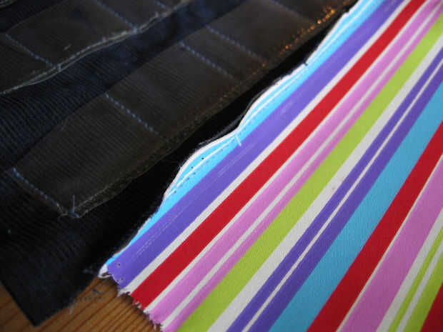 Los pines juntos, luego coser una costura tan recta como sea posible a lo largo de la parte inferior del proyecto. Ver ejemplo del cuadro siguiente. Para que la costura es opuesto el lado cerca de la cinta de velcro. Nota: la imagen no aparece en la tela de forro. Lo hice en un orden raro, pero para facilitar, estoy indicándole a hacer los tres juntos a la vez.