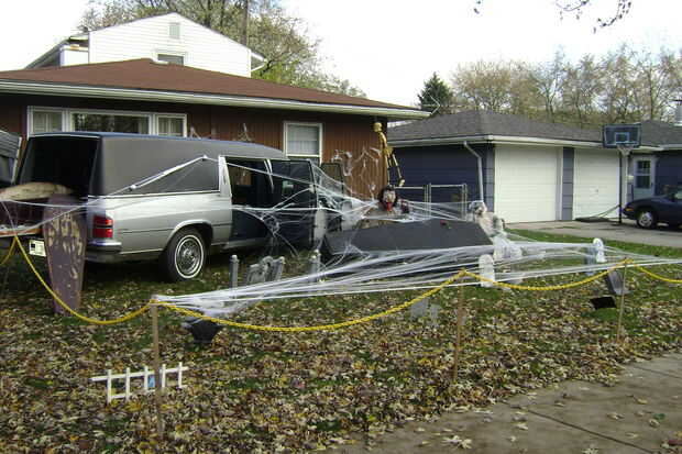 esto es bastante bajo tecnología hemos hecho mi pareja en un cementerio para Halloween. Hemos encontrado una docena decoraciones de piedra sepulcral de espuma en una tienda de dólar y había atornillado a un traje verde. Algunos murciélagos en alambre