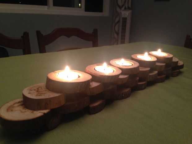La idea era cortar en discos y organizar en algunos falta de forma. Después de jugar con unas formas diferentes, decidí ir con forma de rectángulo largo y apilar los discos madera 4 alta. De los mejores discos, perforé un orificio de 1-5/8" en el centro que recibiría una vela ligera del té. Entonces pegué cada uno de los discos, dejando una separación de 1/4"- 1/2" entre cada pieza. Espero que hayas disfrutado este proyecto. Gracias por ver.