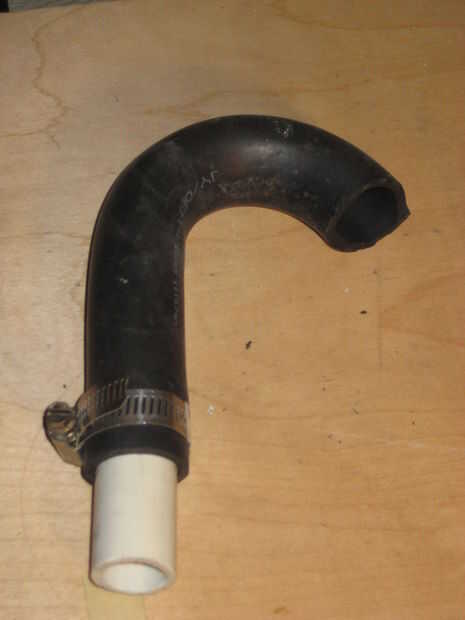 Finalmente, es necesario fijar las aberturas de salida de cada válvula de bola a una longitud apropiada de la manguera, uno va para el drenaje y la otra hasta el tanque de almacenamiento. Utilicé la típica manguera de lavadora (1" ID, 1-1/4" OD), que tiene una pared muy gruesa. La parte superior de cada uno de estos tramos de manguera tiene un extremo del gancho, algo que debe encontrar fácilmente en cualquier ferretería. La segunda foto de abajo muestra cómo utilicé un tramo corto de tubería de PVC de 3/4" a un extremo del gancho una longitud recta de la manguera de la lavadora.
