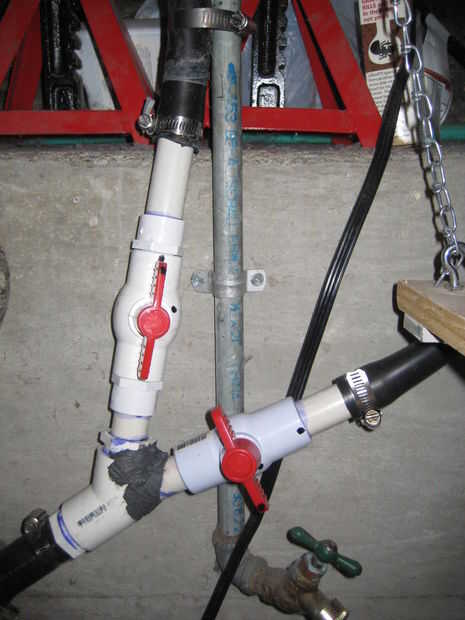 Cada una de las dos válvulas de bola, también pegué un trozo de PVC de 3/4" en cada extremo. El extremo inferior de cada abertura de la válvula entonces se pega con cemento de PVC a las aberturas superiores de la "Y". Una mejor manera de hacer esto habría sido utilizar acoplamientos flexibles entre la "Y" y las válvulas. Siendo un novato en plomería, no sabía sobre esta opción cuando había construido, pero que es lo que yo haría ahora porque entonces la conexión entre la "Y" y las válvulas no sería permanente. (Sin embargo, acoplamientos flexibles no estén disponibles para las pequeñas pipas como estos de todos modos).