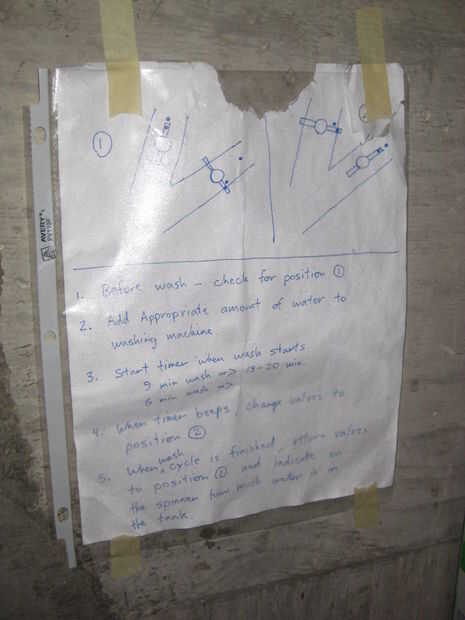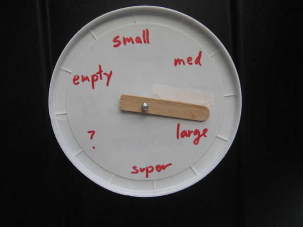 Este medidor se hace desde la parte superior de un envase de yogur de quart y un palito y lo muestra (aproximadamente) la cantidad de agua queda en el tanque después de una carga. Esto puede ser útil a la persona siguiente haciendo la colada. Por ejemplo, si hay una cantidad «Super» de agua en el tanque y hacen una "Pequeña" carga, ellos sabrán que tienen que detener el flujo de agua sí mismos.