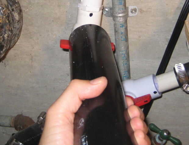 Resulta que estas válvulas de bola pueden tomar fumar mucha fuerza para dar vuelta, así que hice una llave de la válvula de una longitud de tubería de 2" ABS. Como se puede ver en la foto de abajo, hay dos ranuras 3/8" cortadas con una sierra en el extremo de la tubería. Para utilizar la llave, sólo Deslice las ranuras de la manija de la válvula roja y gire.